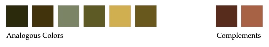 Velázquez’s utilizes a range of analogous colors for most of the The Triumph of Bacchus, shown above. These analogous colors all contain a bit of green. He skillfully offsets the greens with a complementary red. Also note his effective use of low to medium chroma colors. The effect of the analogous colors is to provide unity and cohesion to the overall image. The complementary red provides emphasis for his subject, Bacchus.