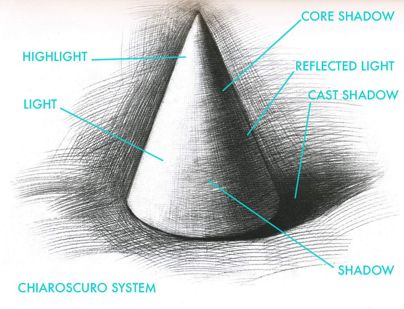The following labelled examples show the system of chiaroscuro to render basic three-dimensional forms. After mastering the basic shapes, the system can be applied to more complex forms. Chiaroscuro forms the basis for creating the illusion of three-dimensionality throughout much of painting and drawing in the Western world.