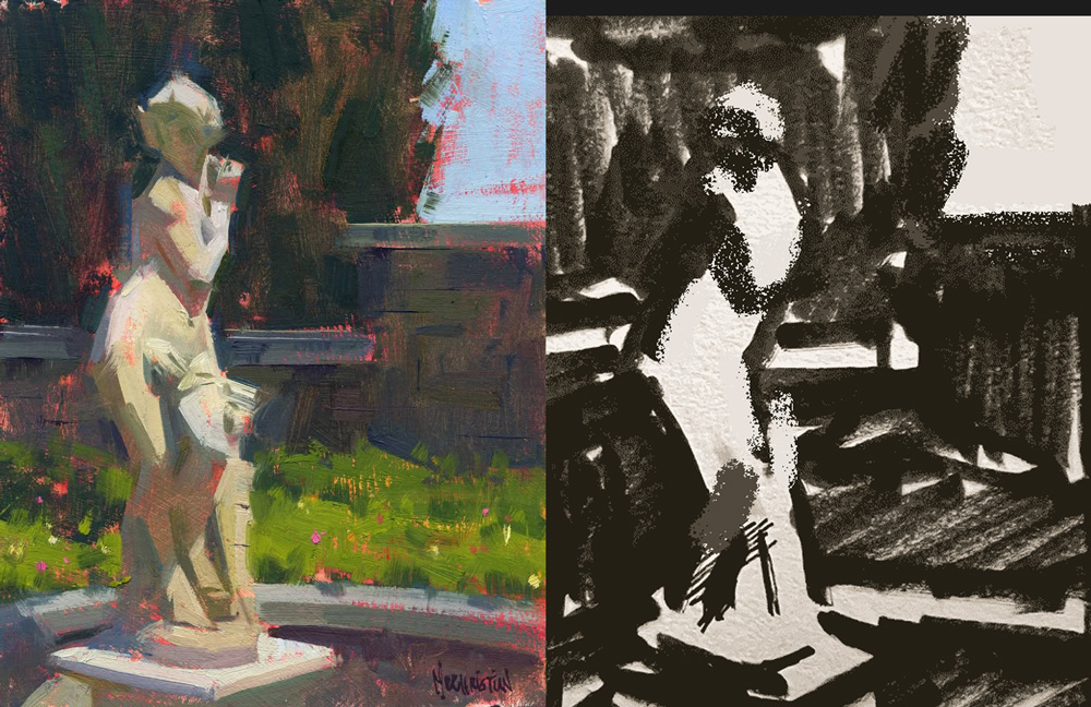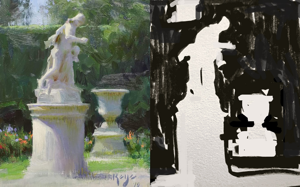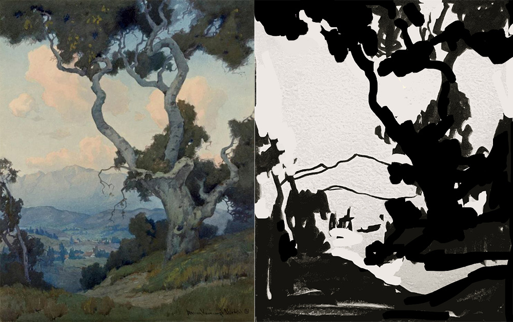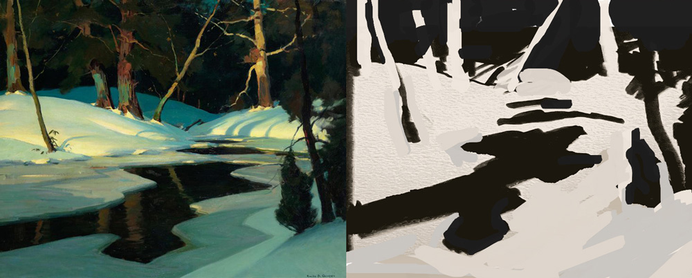 I have a folder of collected landscape paintings, paintings that I think are particularly strong. I have included some of them below. As I looked through them, I realized how almost every one relied heavily on the value relationships to make a strong composition. I have made notan studies of several of them to help you see how strong the value relationships are.