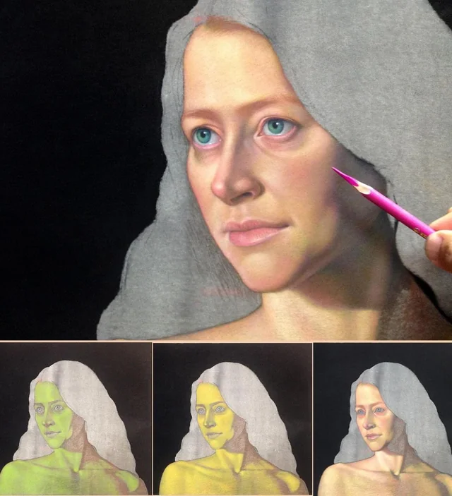 An argument for the verdaille technique for portraits is that the human skin is translucent, and oil paint is translucent, and oil often becomes more translucent with time. Using an underpainting of green, a verdaille, then following it with thin layers of color, called glazes, is said to yield a paint surface that is translucent and luminous like human skin. Green seems to mimic reality better than just grays.