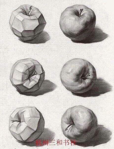 Below are some drawings of fruit. You are to study these and create four pages of fruit and vegetable drawings in your sketchbook. You are think of the fruit/vegetables as planar objects and build them up as planar forms as per these examples. You are to use real fruits and vegetables as models.