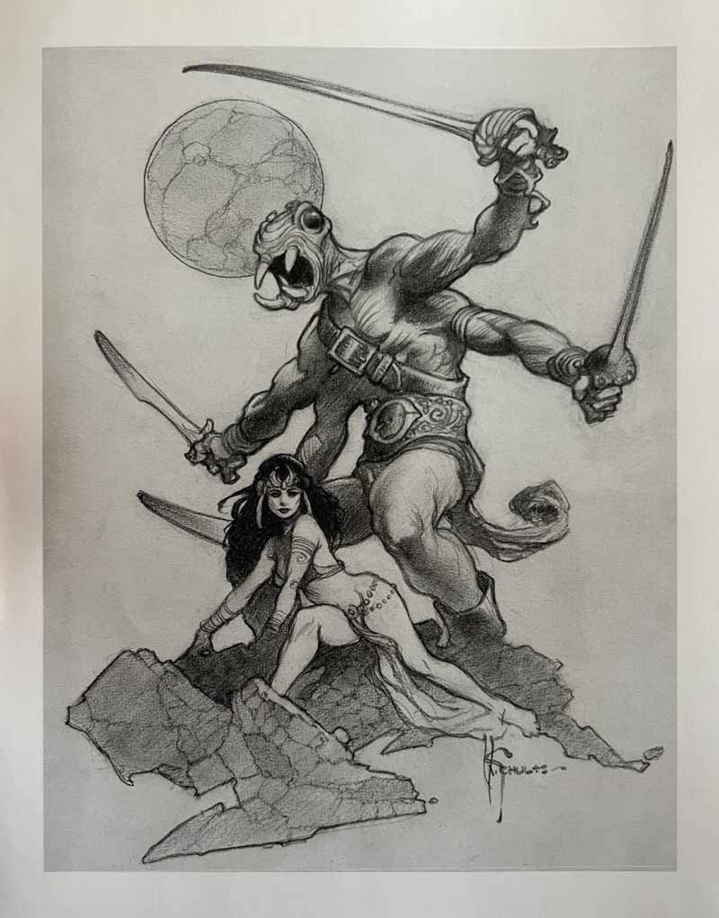 In the image below, Mark Schultz depicts a monster with arms outstretched (along with swords) which creates an engaging silhouette. Even the loin cloth of the monster is flipped up into a visually engaging shape that mimics the shape of the monster's arms and hands. Plus the lower right edge of the rock that the monster is standing on is silhouetted into a shape that is similar to the arms/hands and the loin cloth, hence repeating this design element even further. The forms are similar enough that it causes the viewer's eye to move from one similiar item to the next, thereby helping the viewer's eye to move through the work.
