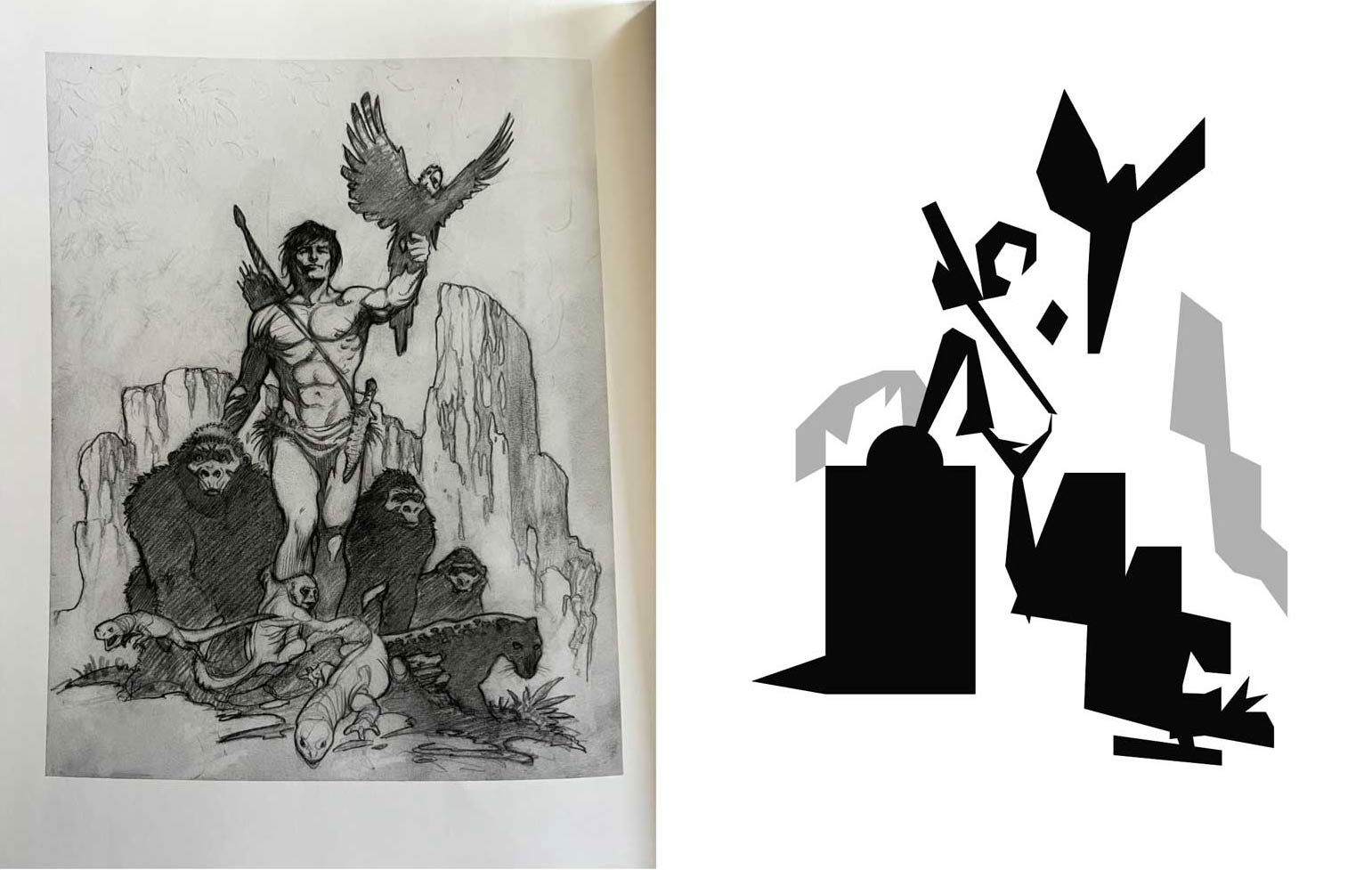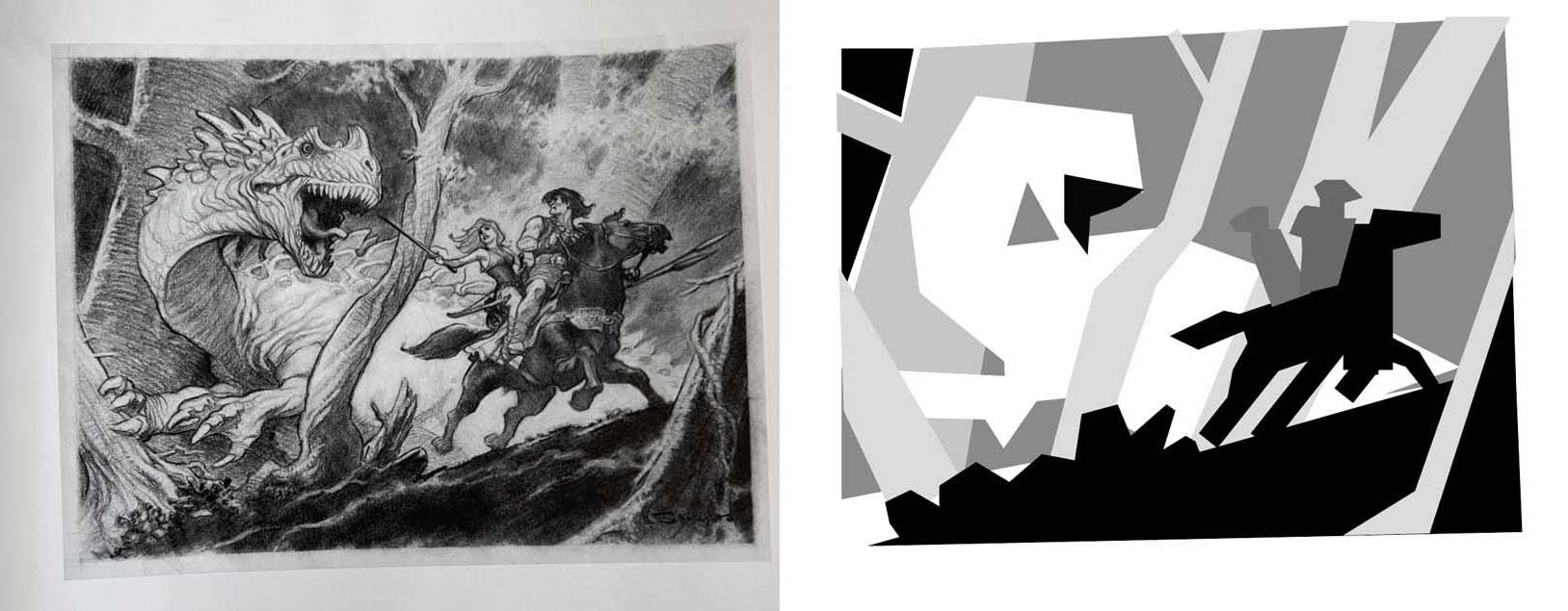 The "paper cut-out" composition studies (located to the right of each drawing) were created in Illustrator.